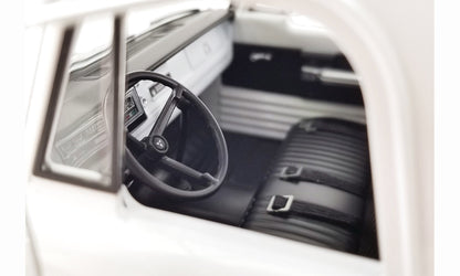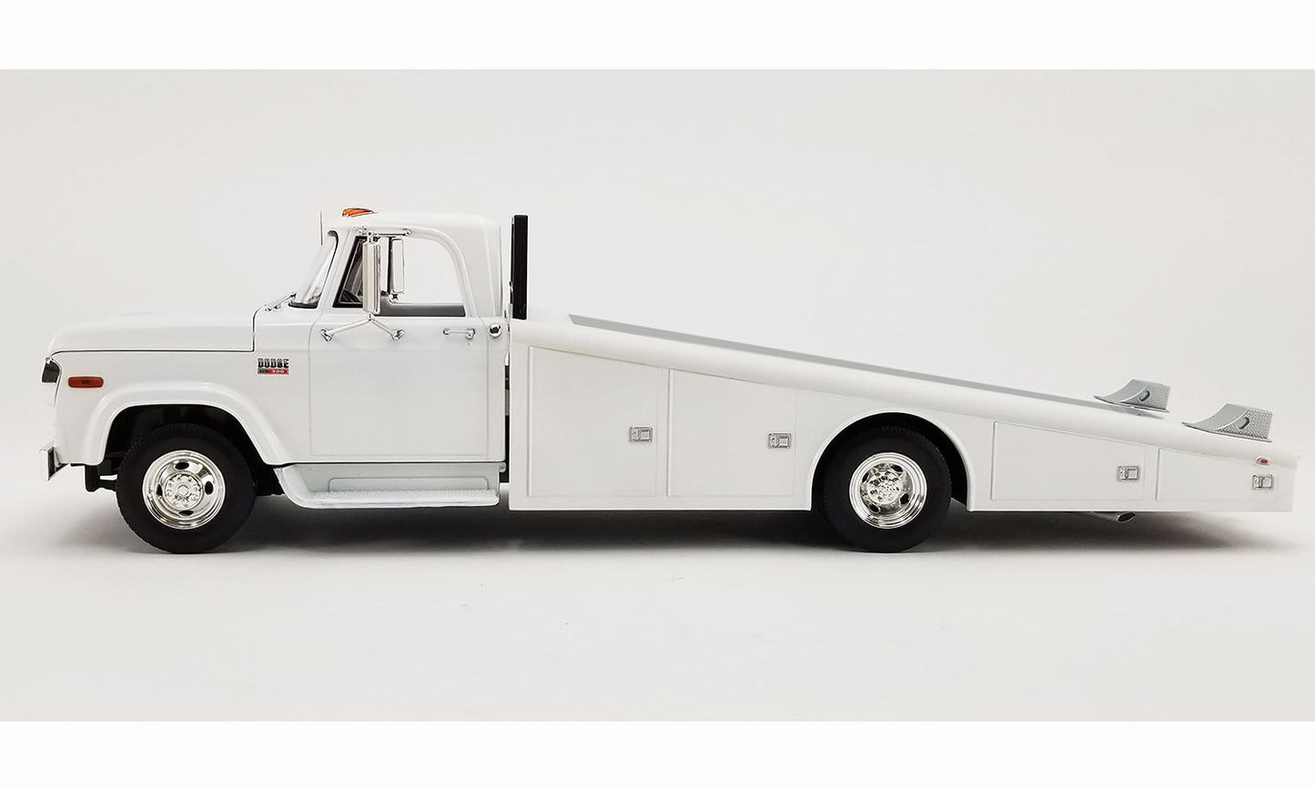 A1801911 Acme - 1970 Dodge D-300 Ramp Truck. 1:18 scale diecast collectible model, sealed (no opening doors). This Dodge is a 16.75"L x 5.25"W x 4"H die-cast metal car. Detailed interior, exterior, and chassis. This 70' Dodge is manufactured by Acme. Individually packed in a decorated box. Box size is 19"L x 7.25"W x 6.5"H. Limited Edition to 434 pcs. Item A1801911 is White.