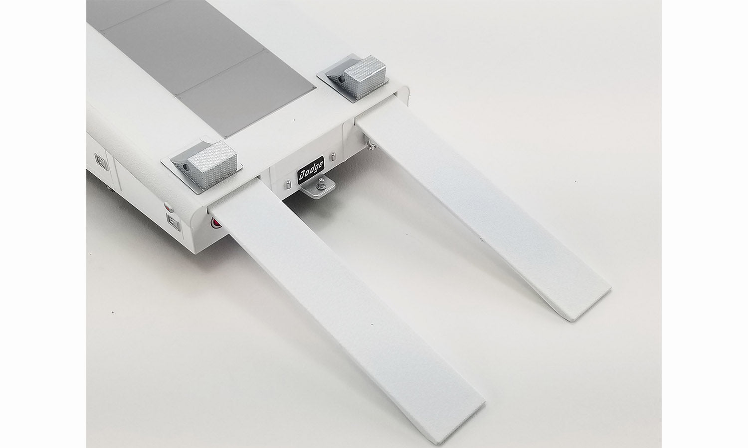 - Adjustable wheel chocks on ramp bed.