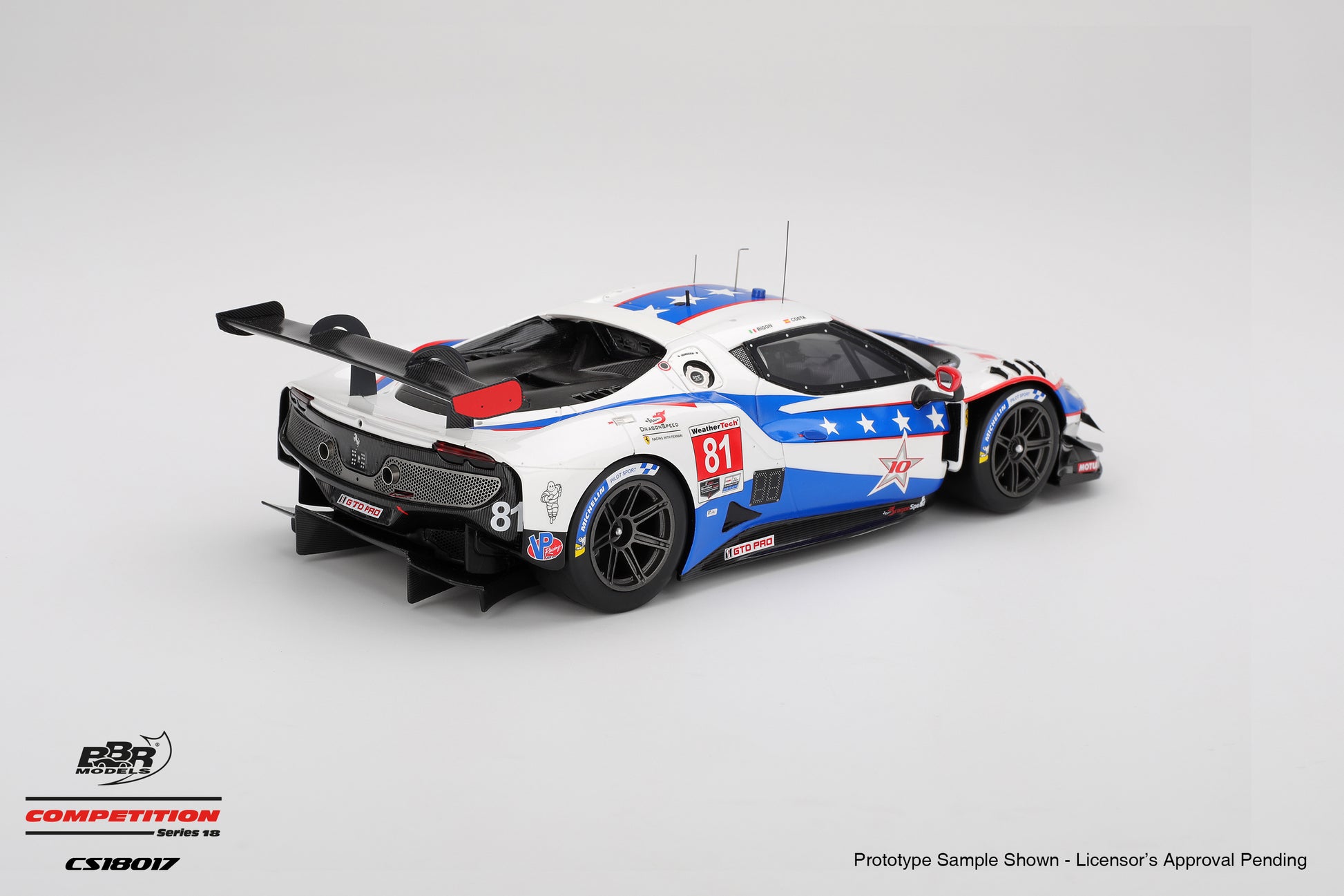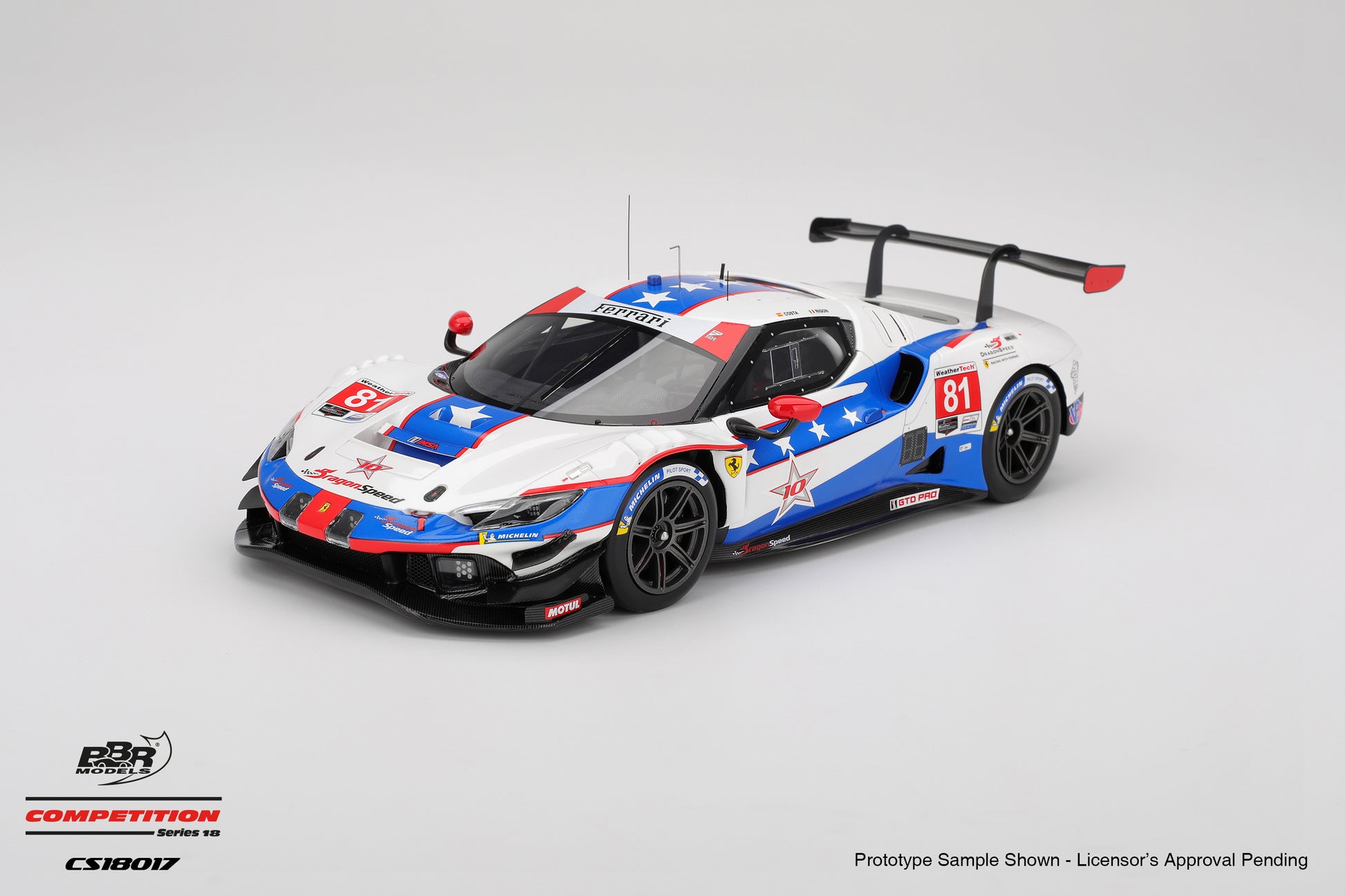 Premium BBR brand in partnership with Topspeed. 1:18 Ferrari 296 GT3 Dragon Speed #81 2025 IMSA Watkins Glen 6 Hr driven by Davide Rigon, Giacomo Altoe, and Albert Costa. This item is made of high quality resin, with immaculate detail, and sealed (no opening parts)