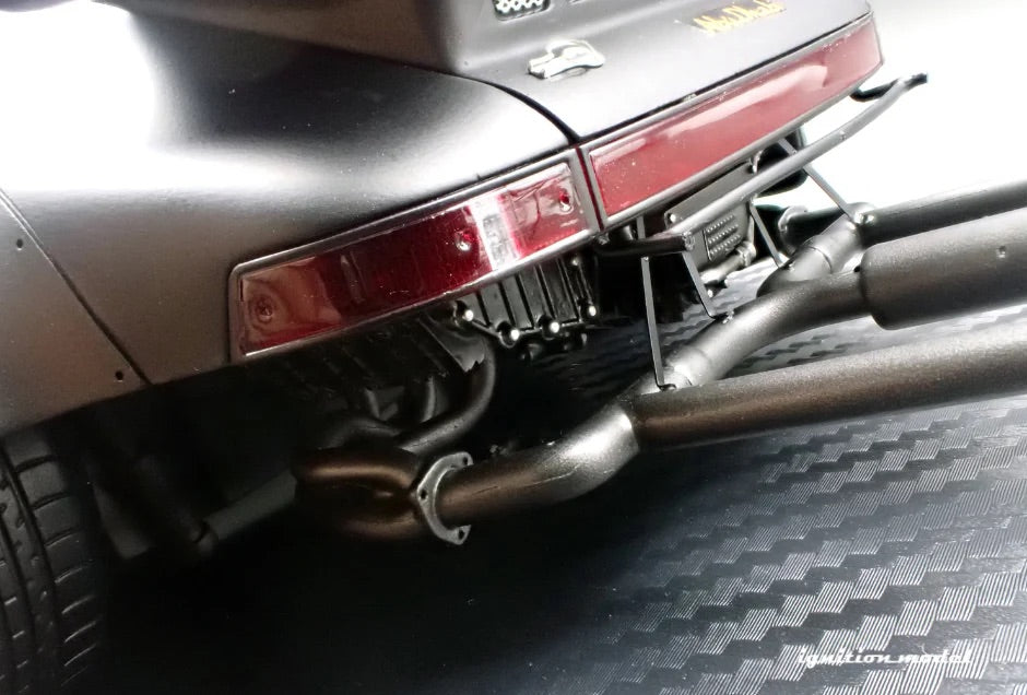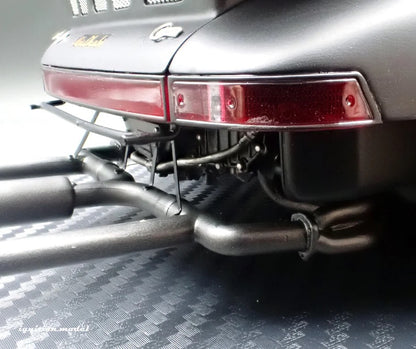 Features lowered suspension with 18-inch SSR Professor SP1-style wheels (bronze). Equipped with wide fenders, a large rear wing, a front lip spoiler, canards on the front fenders, and a rear bumper-less design. The RWB logo is displayed on the front windshield and rear hood, with custom logos under both doors. Silver brake calipers, a reproduction of the car’s actual license plate, bucket seats, a custom steering wheel, a roll cage, and a triple-exit exhaust system are all included.
