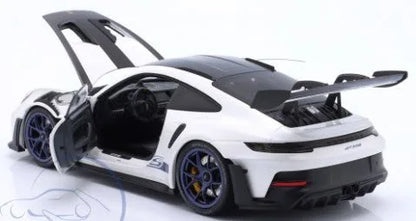 Minichamps 2022 Porsche 911 992 GT3 RS Weissach Pkg, White w/ Blue Wheels & Deco 1:18