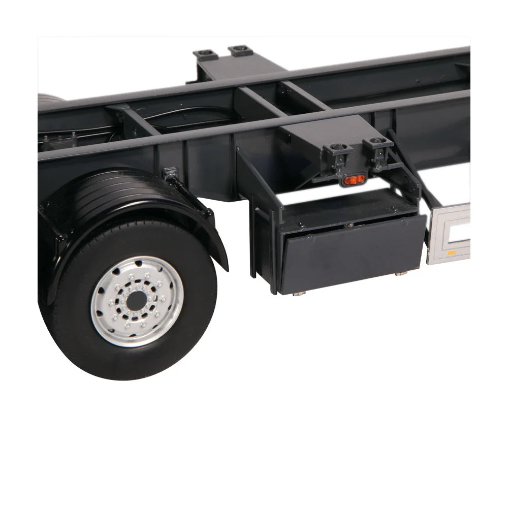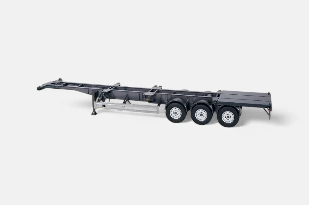 The Semitrailer model features retractable spindle supports with end position latching, an opening storage box, and connections for truck spiral wires. It includes an original container lock at 12 points and can accommodate 1x40ft, 2x20ft, or centrally 1x20ft containers. Additionally, it comes with a tool for unlocking the fifth wheel coupling.
