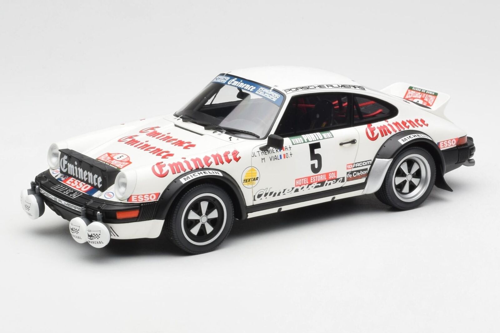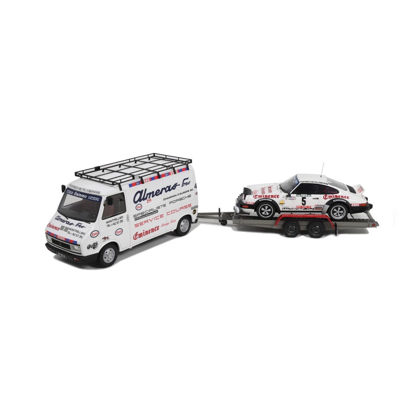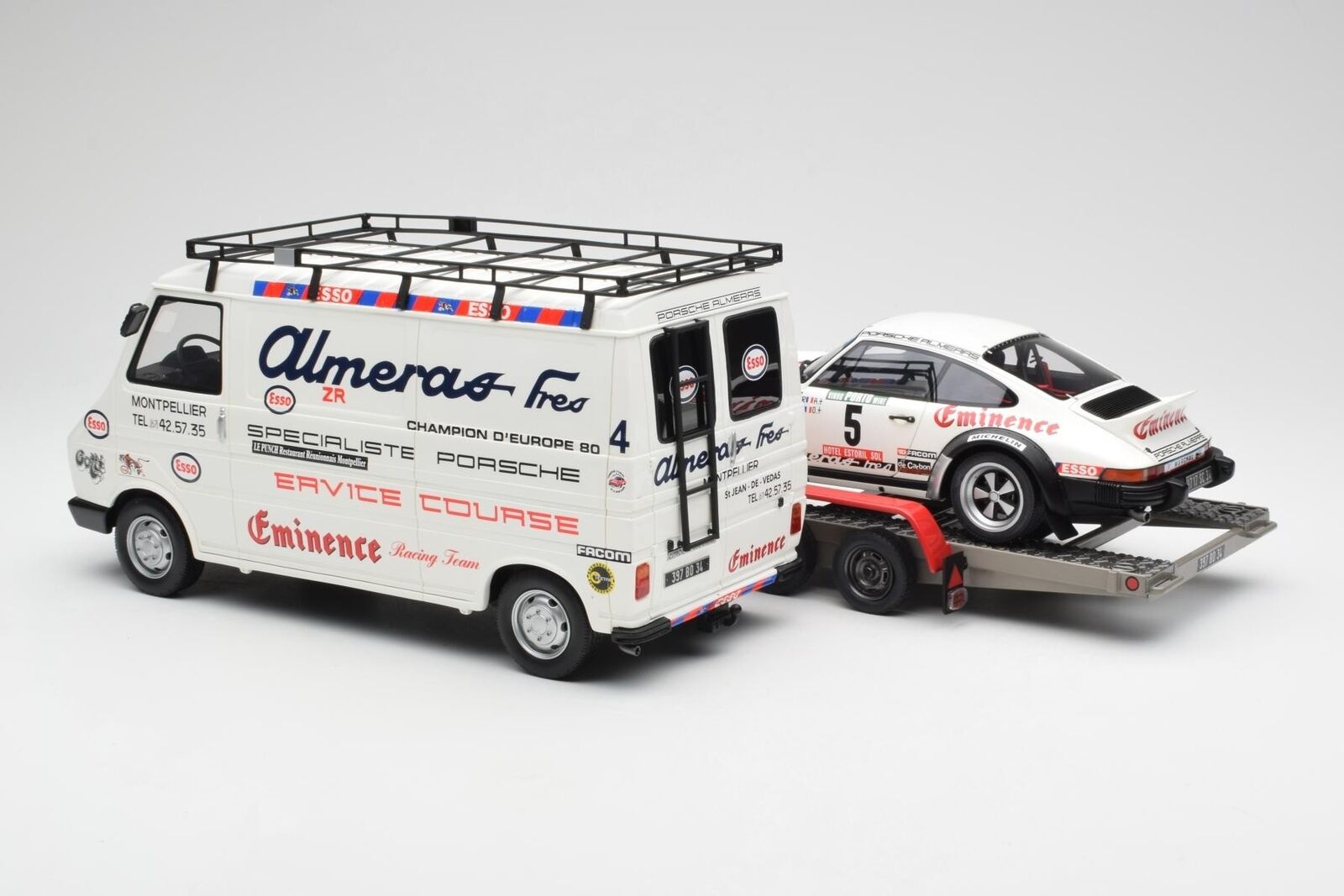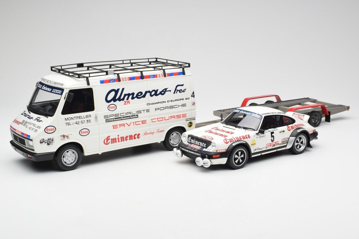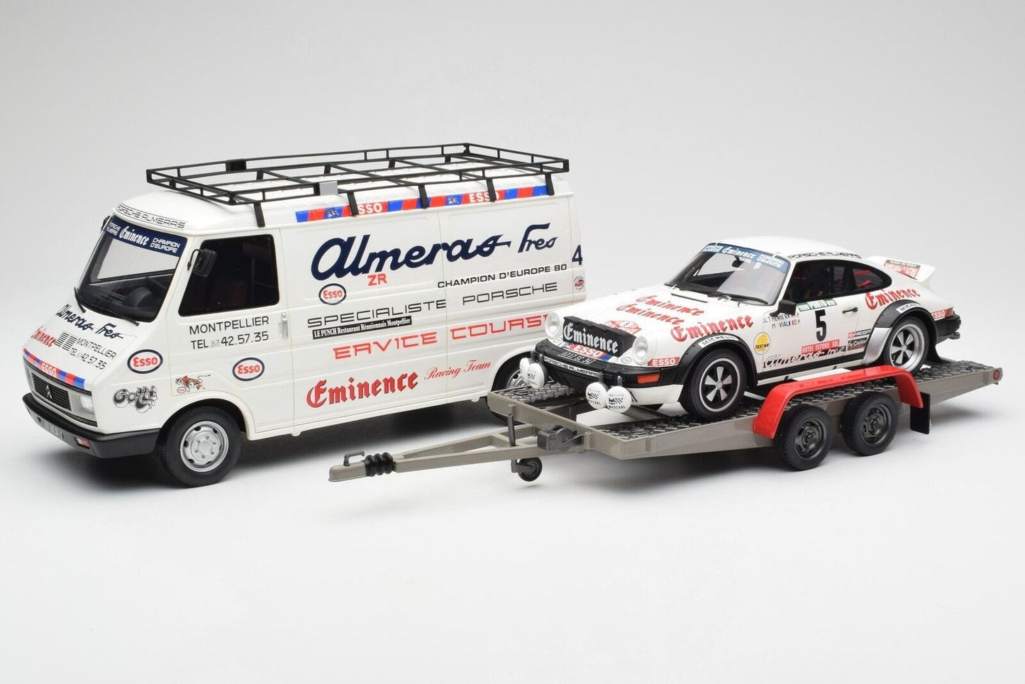 1:18 Scale, 3 piece set from Rallye de Portugal. Includes 911 SC Team Porsche Almeras Gr.4 (night version) #5 driven by Jean Luc Therier and Michel Vial, Trailer, and Citroen C35 Van Assistance in white. This item is resin and sealed (no opening parts). Limited to 2000 pieces worldwide.