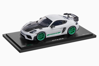 1:18 Scale. The amazing GT4RS w/ Weissach Package in White w/ green wheels by the premium Spark-Model brand, EXCLUSIVE for Porsche Dealers! This item is resin, and comes with its own display showcase!
