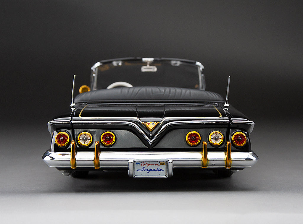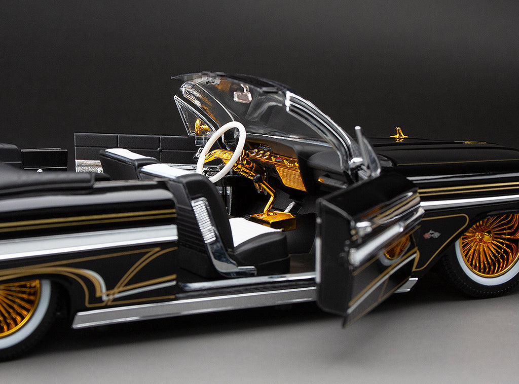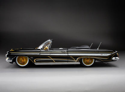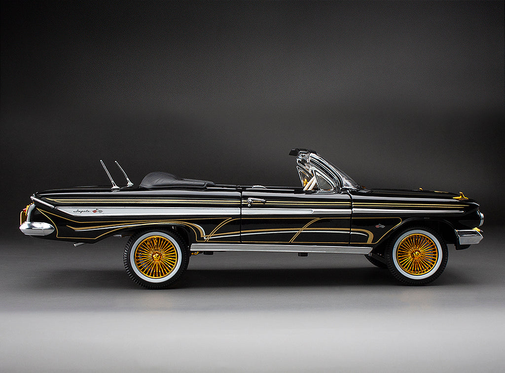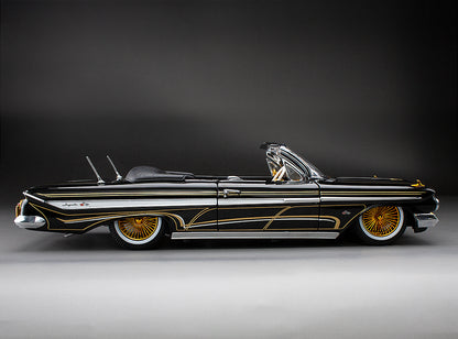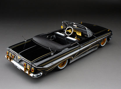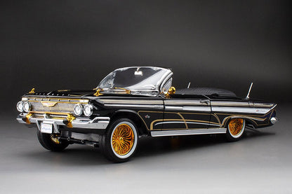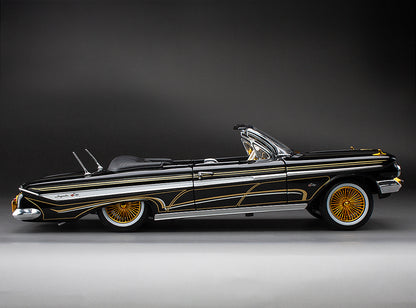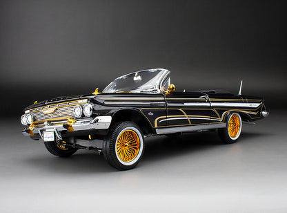 Sun-Star 1961 Chevy Impala Open Convertible Lowrider w Movable Suspension Black w/ Gold Wheels 1:18