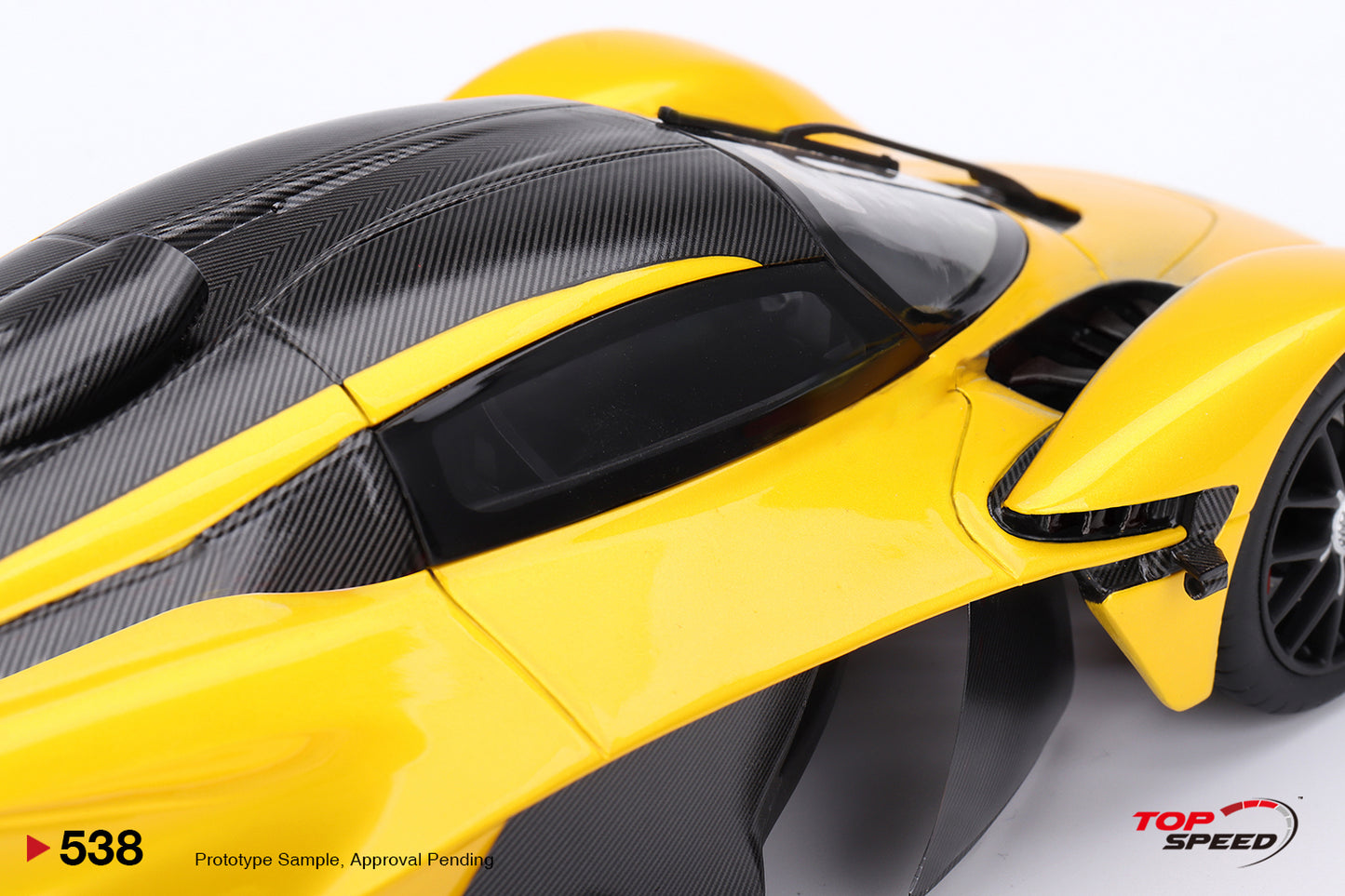 Premium Topspeed brand. 1:18 Aston Martin Valkyrie Sunburst Yellow. This item is made of resin and sealed (no opening parts)